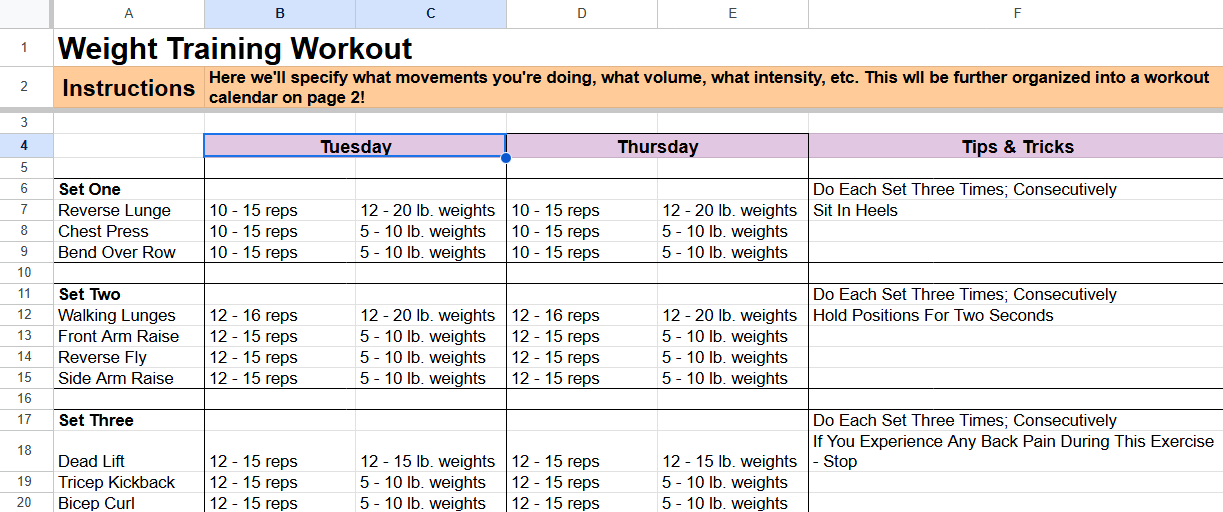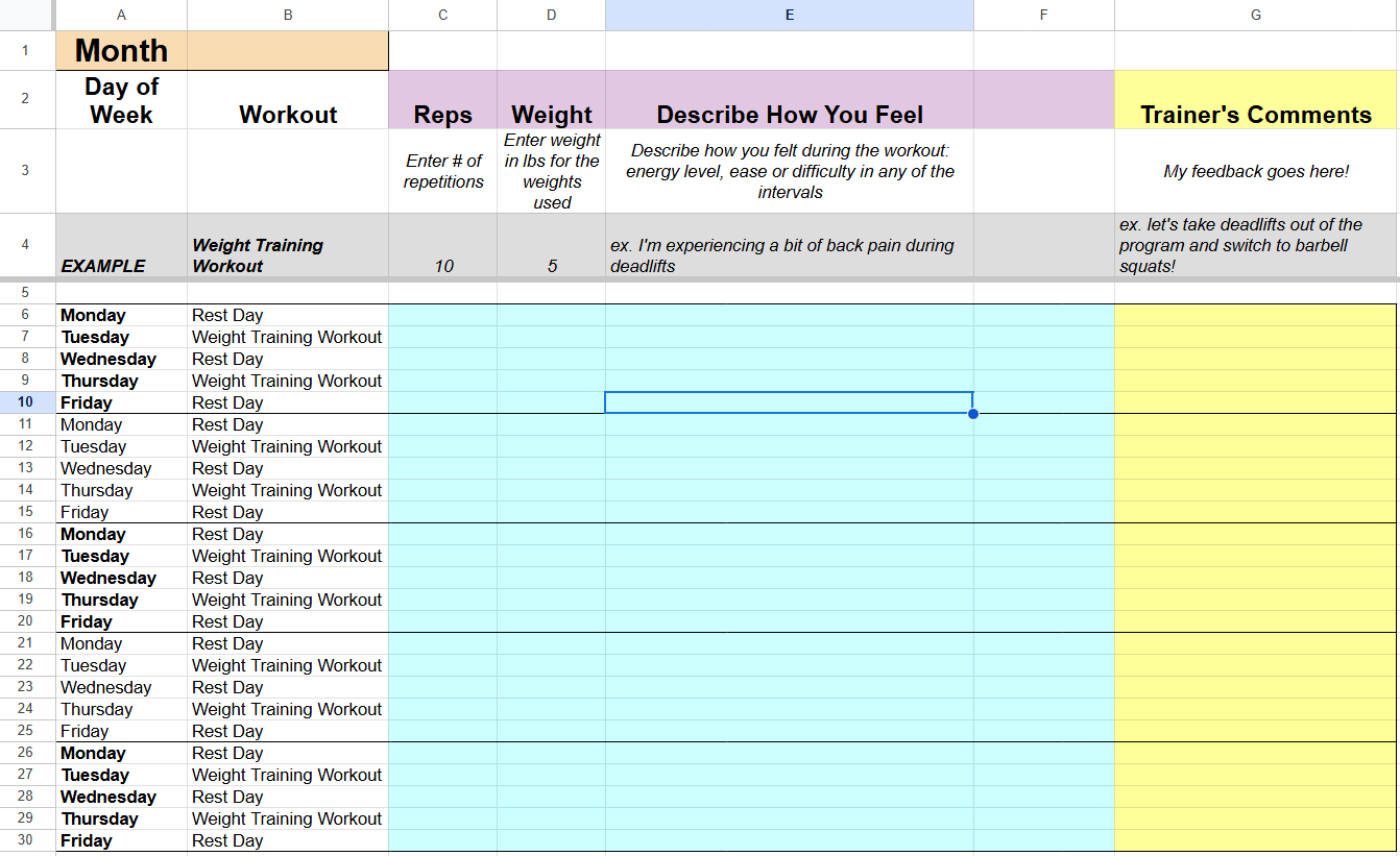 Your workout plan is organized using a simple template in google sheets. All sheets will be shared with you so we can both edit them in real time. This way, we work together to mold a plan that is best suited to your needs. This happens through real-time feedback you provide based on how your workouts make you feel.